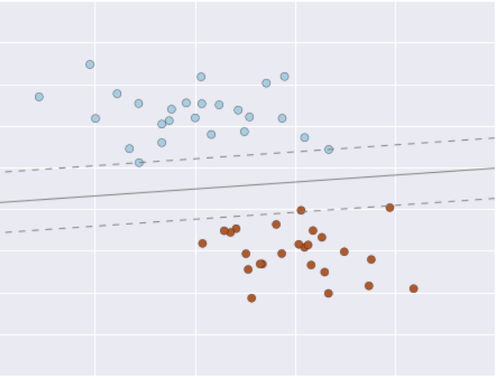 We have two features represented by (x,y) on the plane, which means we have two class labels. From these features and labels, we like to create a model which will predict new points. There are a number of models for such a task, but since our aim is to explain the concept, we will use a simple approach that separates two different groups of points.